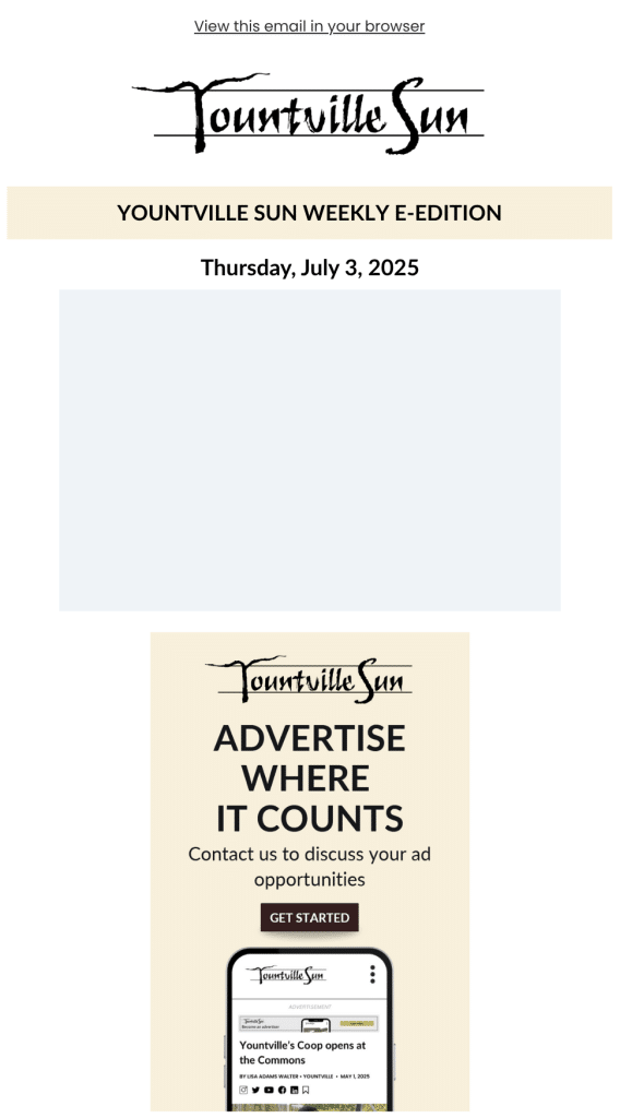 Please note, advertising with the Yountville Sun must be confirmed before ad content is submitted. Ads will run once payment has been received.
