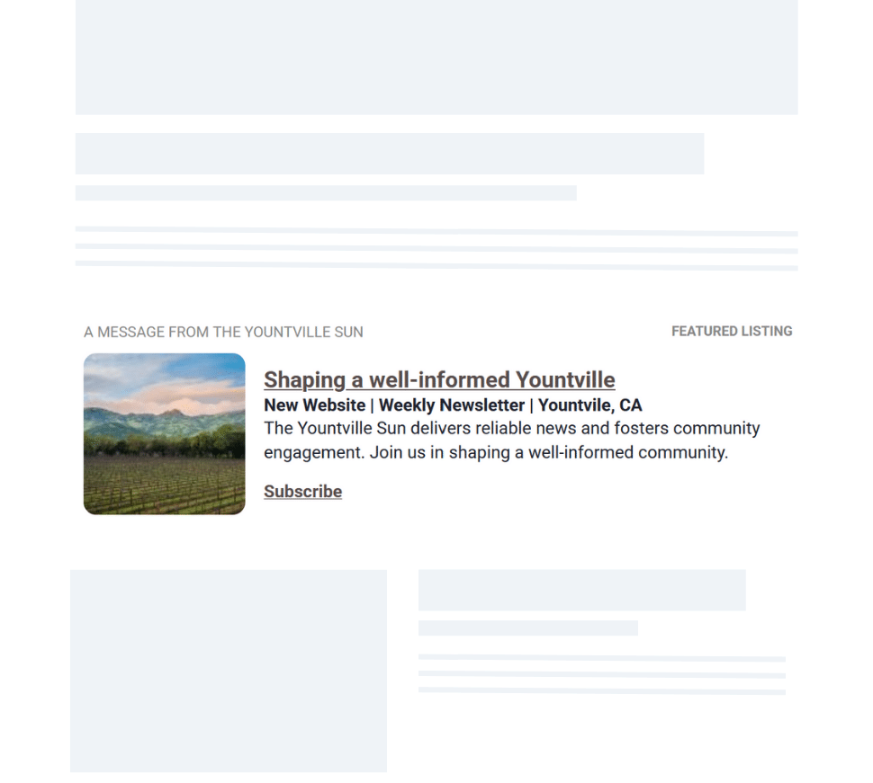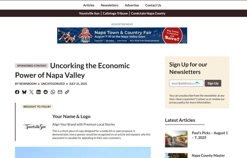 Welcome to the Yountville Sun’s digital spec sheet. Our publication offers a variety of digital advertising opportunities including newsletter, website, and content sponsorships. Share this page with your graphic designer to achieve the best possible results for your ads.