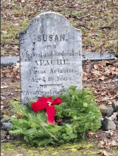What I found so intriguing was that there was a wreath on Susan’s headstone. Why was it there? She was not a veteran and her people only suffered at the hands of the US government. Was her grave on a list designated to receive a wreath, or was it perhaps someone’s casual action with an “extra” wreath, because there were wreaths left over?