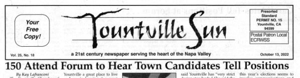 I was hoping to provide a link to those two columns from the Yountville Sun archives the town offers, but they stop at the October 13, 2022 issue. I don’t know why. The Sun was still busy serving the town.