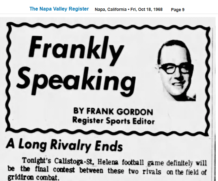 “…Frank Stagnaro, the coach at Calistoga, viewed the end of the rivalry with regret. ‘I hate to see it go,’ he said, ‘and I’m not looking forward to its end even though we usually lose.’ He pointed out that ‘the kids always want to play against St. Helena and it’s sort of part of tradition, the tradition between these two towns and the natural rivalry that exists.’