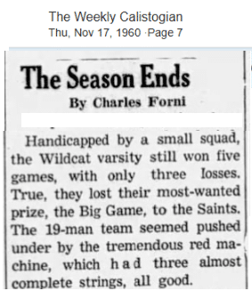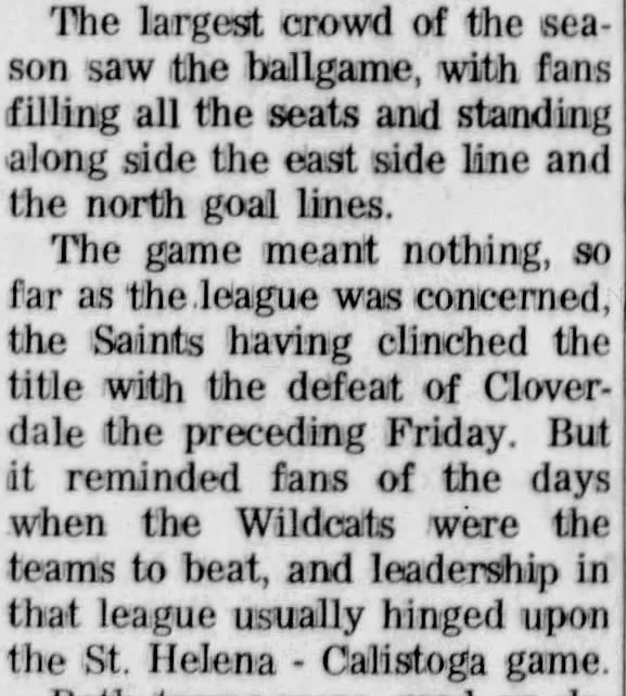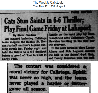 The Calistoga vs. St. Helena rivalry grew over the years. In 1959, the Saints were on a six-game winning streak when the Wildcats fought them to a tie. It was deemed a “moral victory” for Calistoga who embarrassed the Saints on their home field, the last game of the year.