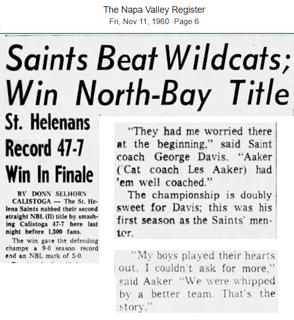 For the 1960 season, George Davis became the (legendary) head football coach for the Saints. In their last game of the season, the Saints overwhelmed the Wildcats 47-7.