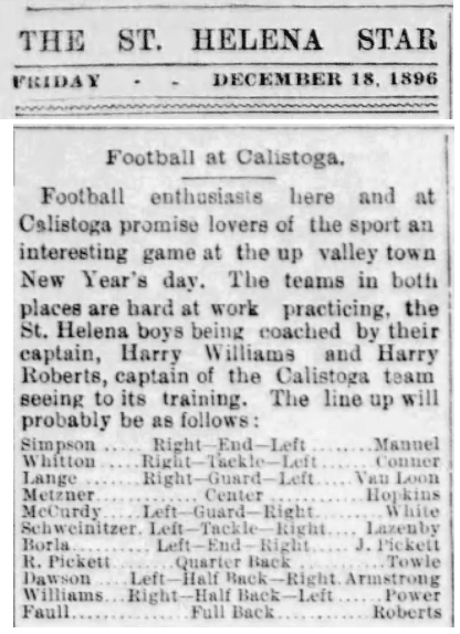 The St. Helena Star of Dec. 18, 1896 reported that the two schools would play a football game on Jan. 1, 1897. Yes, Jan. 1, just like the Rose Bowl. Except the first Rose Bowl wouldn’t be played until five years later, 1902.