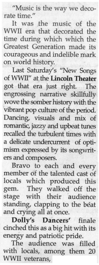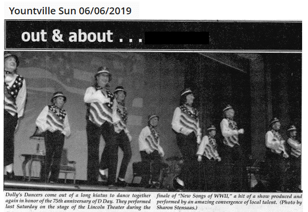 The caption from the print edition of the Yountville Sun reads: Dolly’s Dancers come out of a long hiatus to dance together again in honor of the 75th anniversary of D-Day. They performed last Saturday on the stage of the Lincoln Theater during the finale of “New Songs of WWII: a hit of a show produced and performed by an amazing convergence of local talent. (Photo by Sharon Stensaas).